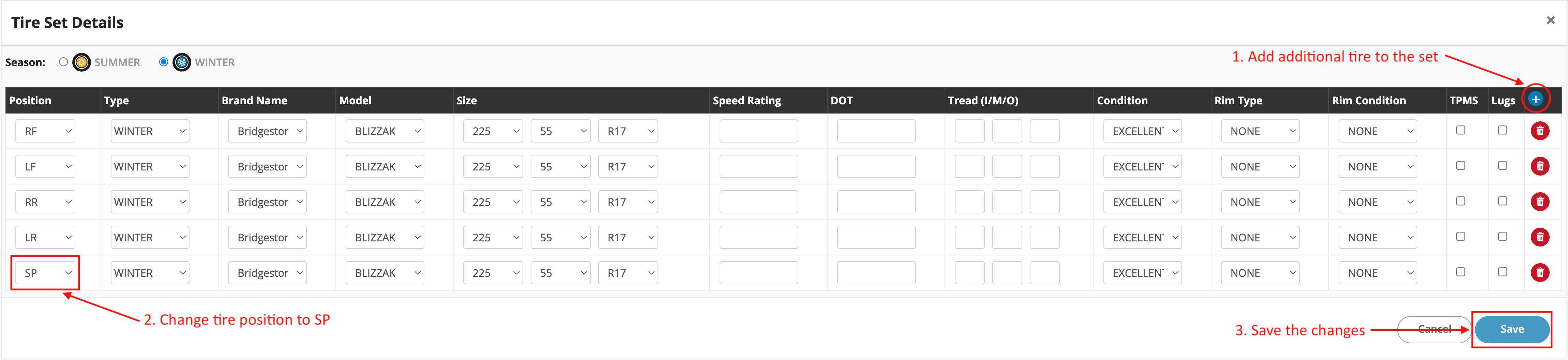 - Click the Save button to update the tire set.